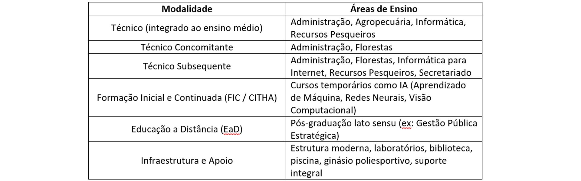 O campus participa do Projeto de Capacitação e Interiorização em Tecnologias Habilitadoras na Amazônia (CITHA), com cursos temporários presenciais voltados para tecnologia e integração ao mercado de trabalho.