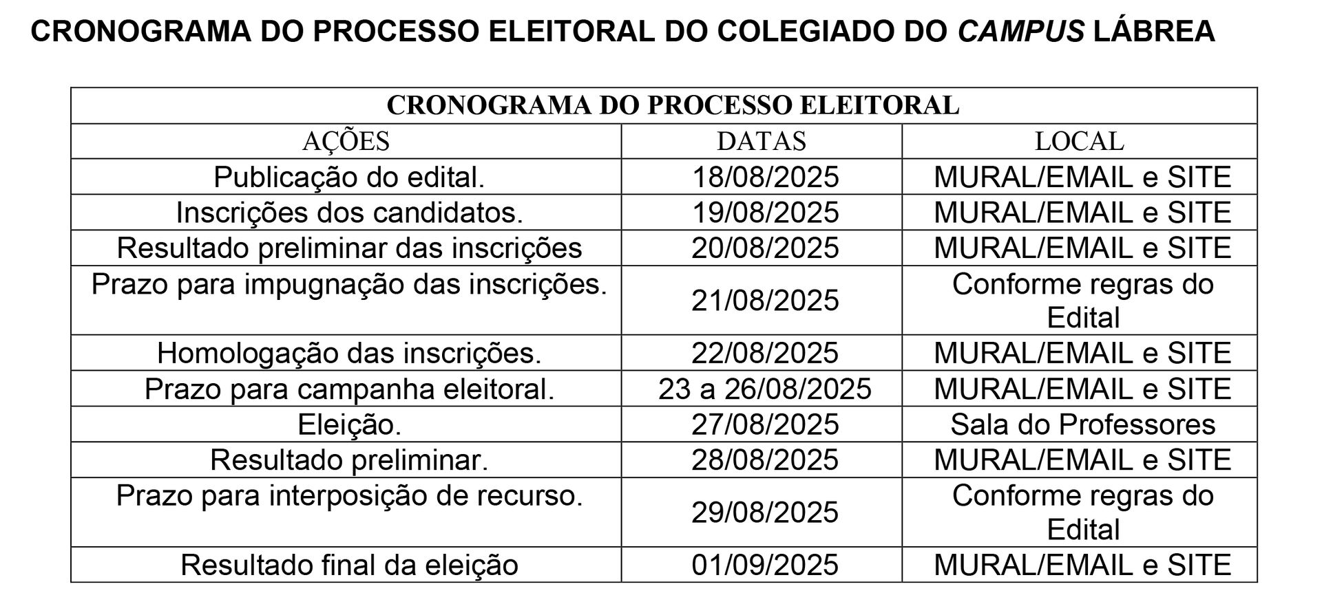 A lista preliminar dos candidatos será publicada no dia 20/08/2025, no site do IFAM Campus Lábre.